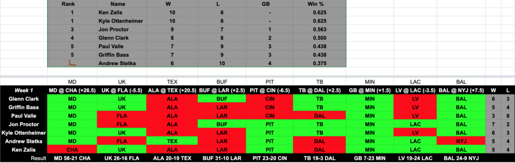 Here’s a look at the current standings as we head into this week along with last week’s results: