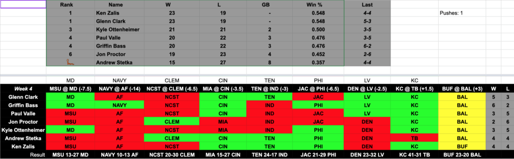 And here’s a look at our updated GCR Picks Contest standings with this weekend’s results as well…Griffin gains some ground after a nice week while Andrew Stetka remains at the bottom of the table: