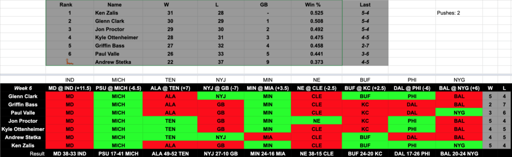 Here is a look at the updated standings heading into Week 7 with Week 6 results: