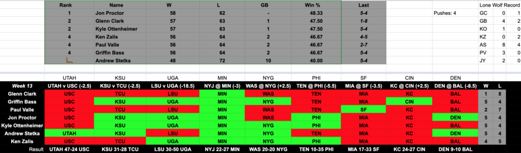 You can listen to the segment in it’s entirety below where you can hear Glenn and Griffin hash out why they chose their respective #1’s in Pats. We also recapped the weekend in the GCR Picks Contest that saw ol’ GC lose the week including our side-bet where now he will have to host an entire show(!) dressed as the Jaguars mascot, American flag thong and all. You can see those updated standings below as well.