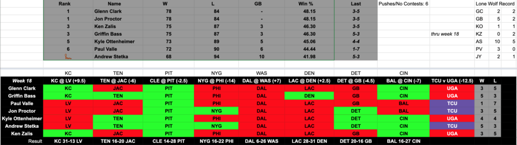 We also recapped the weekend in GCR Picks Contest, that has some relevancy heading into the National Championship tonight between Georgia and TCU with a pork and beans popsicle potentially on the line for Glenn… Here’s the standings: