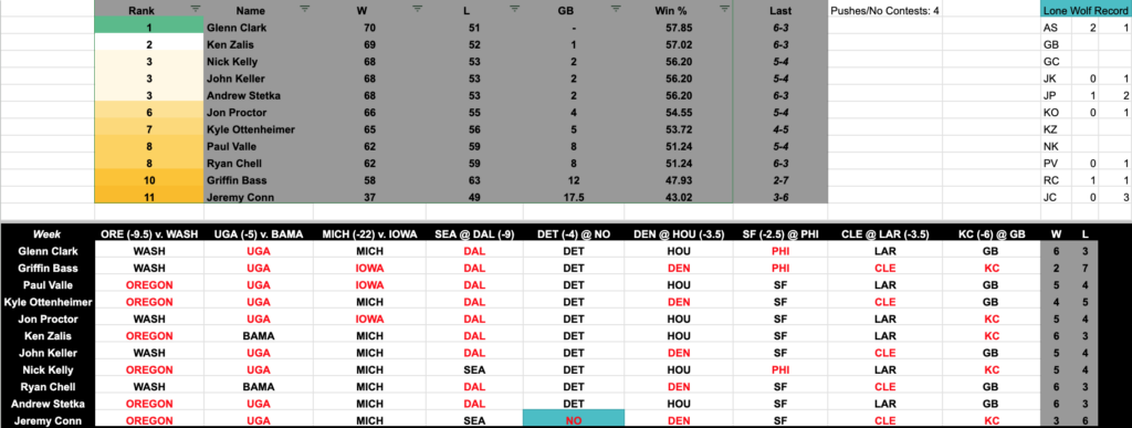On Monday, we also recapped the weekend in the GCR football picks contest… not a good week for Griffin and Jeremy Conn, here’s a look at the updated standings: