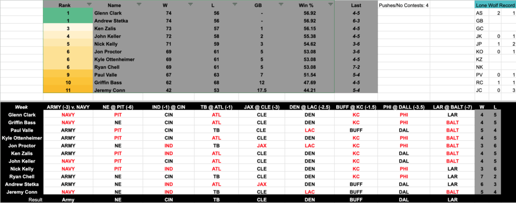 We also recapped the weekend in picks, as Griffin continues to cement himself in ‘Scott Stapp’ position as vice-loser… here’s the updated table with last week’s results: