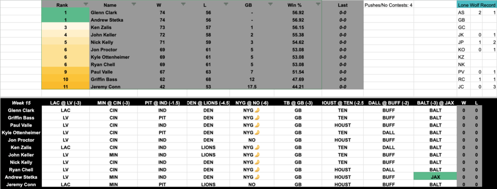 During the 2023 football season on Glenn Clark Radio, we will again be continuing the tradition of being held accountable for our flawed opinions. Glenn, Griffin Bass, Paul Valle III, Kyle Ottenheimer, Jon Proctor, Andrew Stetka, Ken Zalis and three newcomers–Nick Kelly, John Keller and Ryan Chell–choose the nine most interesting games of the week’s football slate and make their picks against the spread. Plus, the addition of Jeremy Conn, who is throwing his name in the hat as of last week, with the belief that he can catch our current losers and avoid being the ultimate loser.