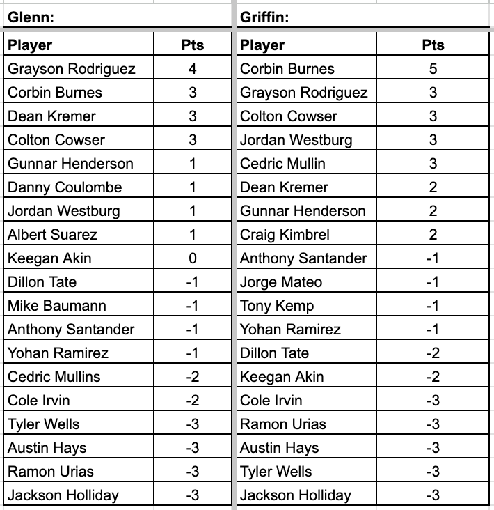 Glenn and Griffin continued their new segment for the 2024 baseball season Monday on GCR with ‘Three Up and Three Down’ where we rank the best and worst Orioles performers of the week, much like how we do with Pats on the Ass and Slaps to the Helmet during football season after Ravens games. The guys will each name three players, three trending up, three trending down, based on how they did for that week specifically.