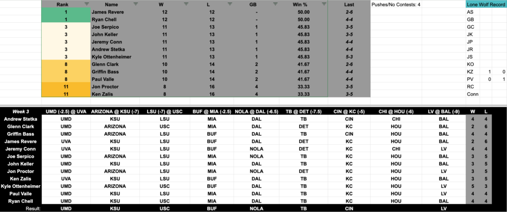We also recapped the weekend in picks, an abysmal week for everyone involved…the good news is, it’s still early. Here are the updated standings: