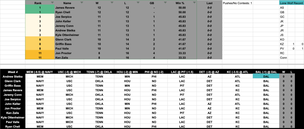 During the 2024 football season on Glenn Clark Radio, we continue the tradition of being held accountable for our flawed opinions. Glenn, Griffin, Paul Valle III, Kyle Ottenheimer, Jon Proctor, Ken Zalis, Ryan Chell, John Keller, Jeremy Conn and two newcomers–Joe Serpico and James Revere–choose the nine most interesting games of the week’s football slate and make their picks against the spread, three College Football games, six NFL games. Oh, and our friend Andrew Stetka is of course back for this season, he knows the rules, the only way out is to win the league, or SPECTACULARLY avoid losing. We will pick six of the top NFL games this weekend and three of the top College Football games.