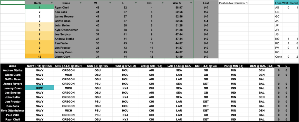 During the 2024 football season on Glenn Clark Radio, we continue the tradition of being held accountable for our flawed opinions. Glenn, Griffin, Paul Valle III, Kyle Ottenheimer, Jon Proctor, Ken Zalis, Ryan Chell, John Keller, Jeremy Conn and two newcomers–Joe Serpico and James Revere–choose the nine most interesting games of the week’s football slate and make their picks against the spread, three College Football games, six NFL games. Oh, and our friend Andrew Stetka is of course back for this season, he knows the rules, the only way out is to win the league, or SPECTACULARLY avoid losing. We will pick six of the top NFL games this weekend and three of the top College Football games.