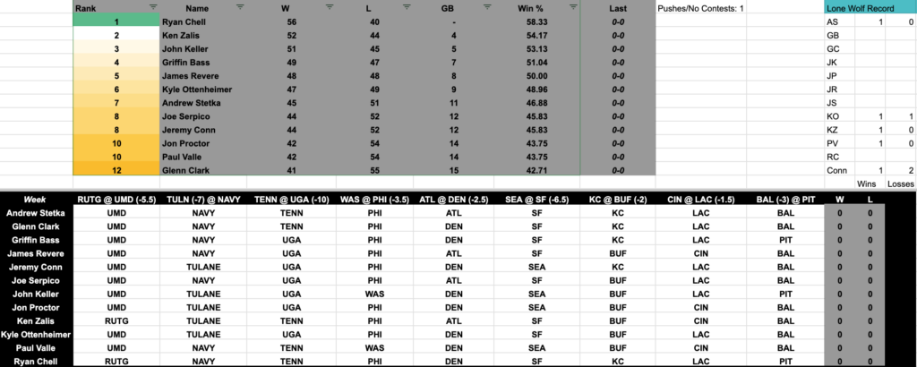 During the 2024 football season on Glenn Clark Radio, we continue the tradition of being held accountable for our flawed opinions. Glenn, Griffin, Paul Valle III, Kyle Ottenheimer, Jon Proctor, Ken Zalis, Ryan Chell, John Keller, Jeremy Conn and two newcomers–Joe Serpico and James Revere–choose the nine most interesting games of the week’s football slate and make their picks against the spread, three College Football games, six NFL games. Oh, and our friend Andrew Stetka is of course back for this season, he knows the rules, the only way out is to win the league, or SPECTACULARLY avoid losing. We will pick six of the top NFL games this weekend and three of the top College Football games.
