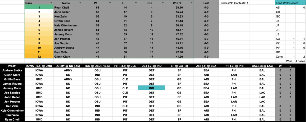 During the 2024 football season on Glenn Clark Radio, we continue the tradition of being held accountable for our flawed opinions. Glenn, Griffin, Paul Valle III, Kyle Ottenheimer, Jon Proctor, Ken Zalis, Ryan Chell, John Keller, Jeremy Conn and two newcomers–Joe Serpico and James Revere–choose the nine most interesting games of the week’s football slate and make their picks against the spread, three College Football games, six NFL games. Oh, and our friend Andrew Stetka is of course back for this season, he knows the rules, the only way out is to win the league, or SPECTACULARLY avoid losing. We will pick six of the top NFL games this weekend and three of the top College Football games.