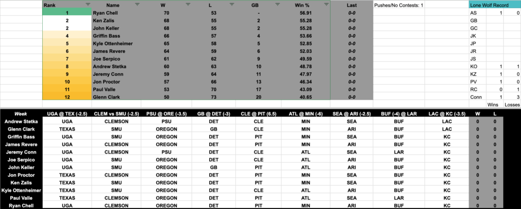 During the 2024 football season on Glenn Clark Radio, we continue the tradition of being held accountable for our flawed opinions. Glenn, Griffin, Paul Valle III, Kyle Ottenheimer, Jon Proctor, Ken Zalis, Ryan Chell, John Keller, Jeremy Conn and two newcomers–Joe Serpico and James Revere–choose the nine most interesting games of the week’s football slate and make their picks against the spread, three College Football games, six NFL games. Oh, and our friend Andrew Stetka is of course back for this season, he knows the rules, the only way out is to win the league, or SPECTACULARLY avoid losing. We will pick six of the top NFL games this weekend and three of the top College Football games.