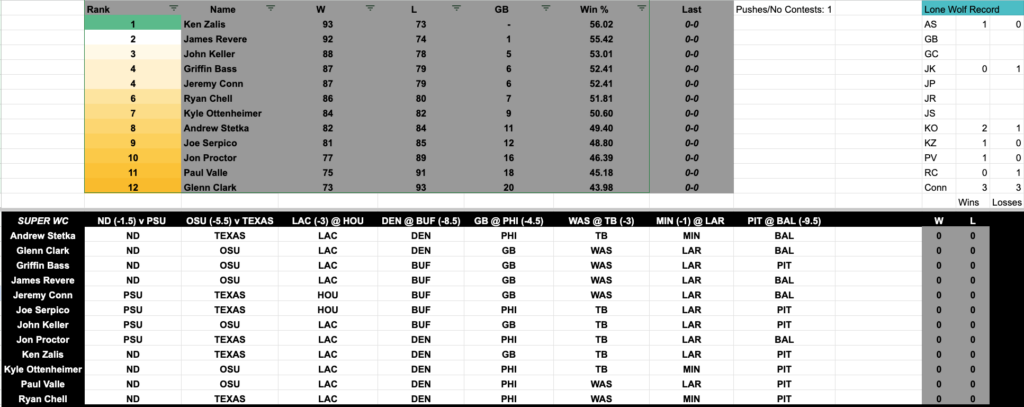 Without further adieu, here is the SUPER Wild Card Weekend slate + the two CFP Semifinal games with much on the line at both the top of the table (playing for a little bit of cash) and at the bottom (playing LOTS more):