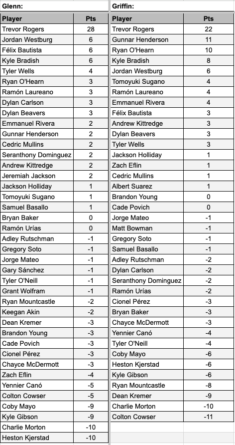 I really wanted to find a way to get Coby Mayo (8-22) on the list but the three starters were too good to leave any of them off. Wells allowed just four baserunners and one run over six innings in his only start.