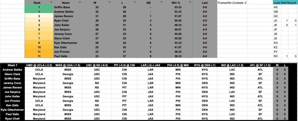 A refresher on how the game works, the gang will select the nine most compelling games of the week’s football slate and make their picks against the spread, three College Football games, six NFL games.