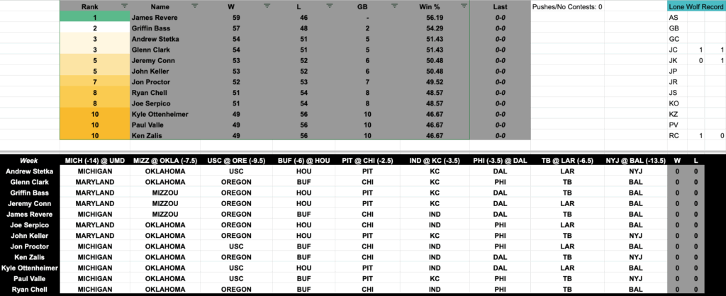 A refresher on how the game works, the gang will select the nine most compelling games of the week’s football slate and make their picks against the spread, three College Football games, six NFL games.