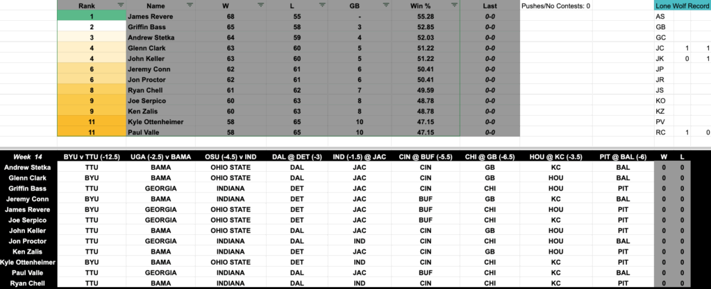 Ken Zalis joined Glenn and Griffin–as he does every Thursday–to help the boys make their picks, you can watch along by clicking play on the video below, starting at the 59:08 mark. You can also check out the updated season-long standings, and if you’d like just audio, click the SoundCloud player to hear KZ, Glenn and Griffin breakdown the Week 14 slate, culminating in our Ravens/Steelers breakdown: