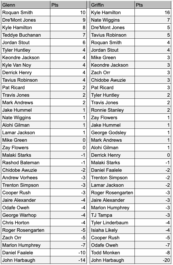 Ravens get themselves off the AFC North schneid with a shutout victory in Cincinnati defeating Joe Burrow and the Bengals 24-0. Defense led the way, so let’s see how Glenn and Griffin saw things stacking up in our Pats on the Ass lists: