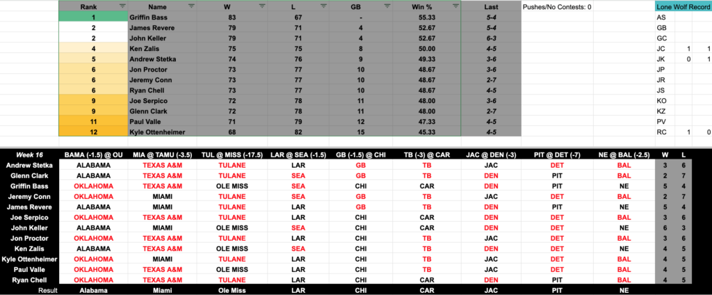 Here are the updated GCR Picks Contest standings, Griffin remains firmly at the top as Glenn gives company to our basement dwellers: