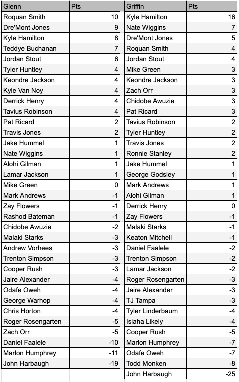 And the season-long Ravens standings, players getting positive points for ‘Pats’ and negative points for ‘Slaps’: